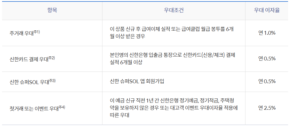 📌 주거래 우대: 신한은행 계좌에 6개월 이상 급여를 이체하면 1.0%의 우대 금리가 적용됩니다.