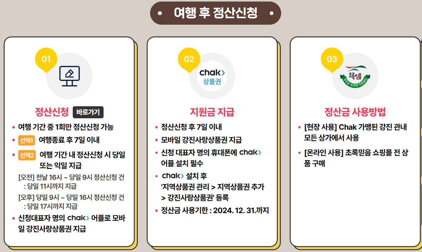 📌정산금 지급: 당일 지급 또는 정산 신청 후 7일 이내에 모바일 강진사랑상품권으로 지급