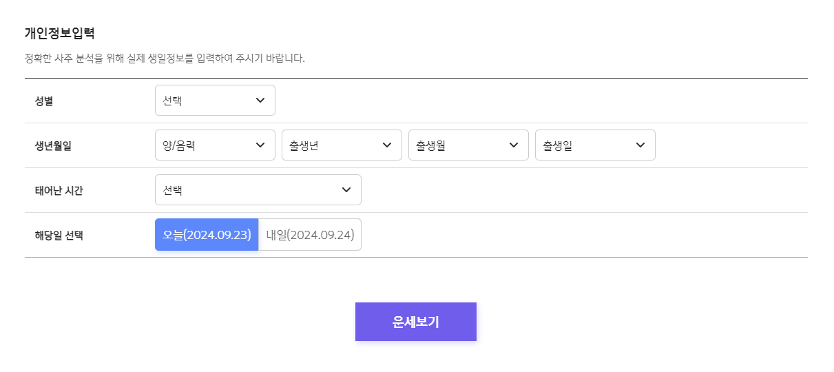 성별, 생년월일(양력/음력)과 태어난 시간을 입력한 후 운세 결과를 확인할 수 있습니다.